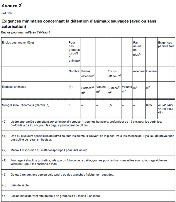 La loi suisse, dans son Ordonnance sur la protection des animaux (OPAn) [ 455.1 ], impose des exigences minimales concernant la détention des animaux depuis le 23 avril 2008.