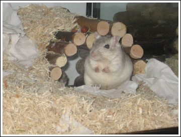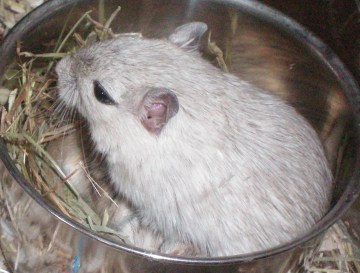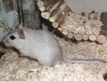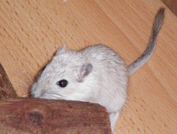 Une gerbille CP Agouti ressemble beaucoup à une gerbille Grey Agouti en légèrement plus claire. La queue est dite "en flèche" car le foncé forme une flèche à son extrémité. Le dessous de la queue est claire. |