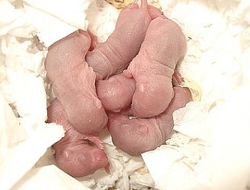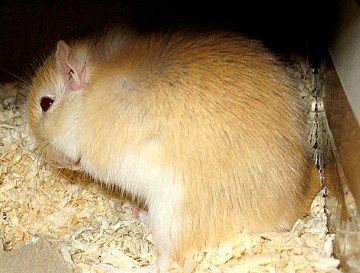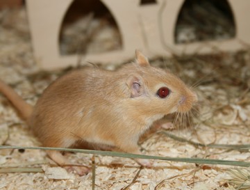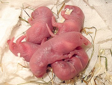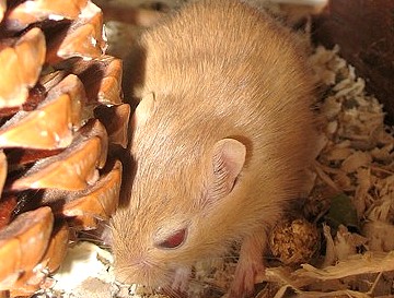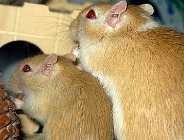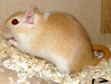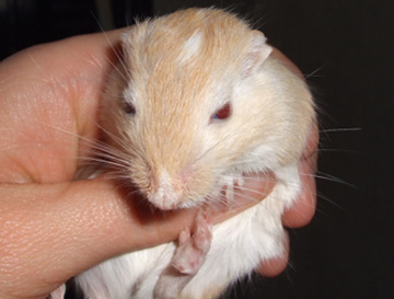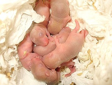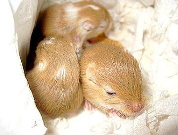 1 - Bébés à la naissance 2 - Bébés à 3 jours 3 - Bébés à 5 jours 4 - Bébé de 12 jours 5 - Bébés à 20 jours 6 - Bébé de 1 mois 7 - Jeune de 2 mois A la naissance, la peau est rose. La couleur de la paupière est rosée, comme le reste du corps (contrairement aux bébés aux yeux noirs qui ont une paupière très foncée). Cela indique de façon sûre que la gerbille aura les yeux rouges. Vers 3 jours, le tout premier duvet gris apparait, puis à 5 jours il commence doucement à dorer. A partir de 10 jours environ, la couleur est presque définitive et variera très discrètement lors de la mue. |
