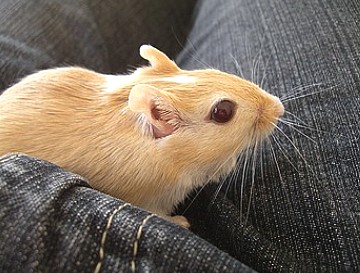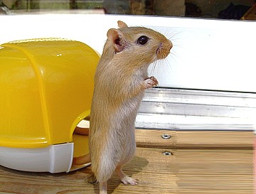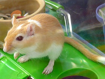 1 - Argente Golden 2 - Argente Golden Spotted porteuse "-e" 3 à 5 - Argente Golden Spotted 6 - différence entre une Argente Golden et une Argente Golden Spotted porteuse "-e" 7 - Argente Golden Spotted porteuse "-e" : Le ventre blanc remonte bien haut 8 - Argente Golden à 2,5 mois Les griffes sont incolores (ligne veineuse visible). Les pattes sont blanches. La queue est dorée comme le dos et présente un plumet de poils gris clairs à partir des deux tiers de la queue jusqu'à la pointe. Si la gerbille est génétiquement "Ee", le ventre remonte un peu plus haut et est légèrement plus clair. |