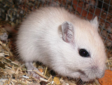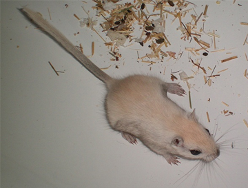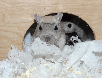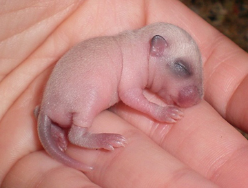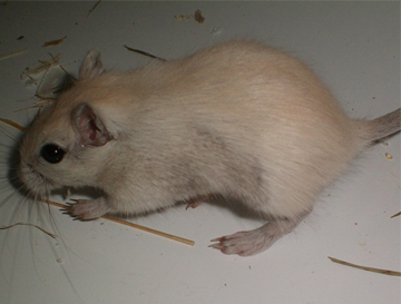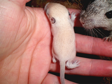 1 - à 7 jours, le Silver Nutmeg a un duvet beige grisonnant. Il a la queue et les oreilles qui se teintent également. 2 - à 11 jours, la teinte crème se pare d'une tiqueture grise. 3 - bébé Polar Fox à 17 jours (au milieu, la différence avec les Silver Nutmeg s'amenuise) 4 - à 6 semaines, ses flancs commencent la mue. 5 & 6 - à 7 semaines, les flancs grisés remontent, on note la même coloration sur le museau et la queue. 7 - à 8 semaines, la mue est déjà bien avancée. Il ne reste de crème que sur le crâne. A la pousse du premier duvet il est aisé de différencier un bébé Silver Nutmeg d'un bébé Polar Fox. Le petit Silver Nutmeg est beige crème grisé tandis que le petit Polar Fox est beige crème un peu plus clair et non grisé. En grandissant et jusqu'à la mue, il est quasiment impossible de les différencier car le gris du pelage des Silver Nutmeg disparait. La mue des Silver Nutmeg commence un peu plus tôt (vers 8 semaine) et est plus rapide que la mue des Polar Fox. Le premier indice de la mue est que le museau se colore très vite en gris foncé. |
