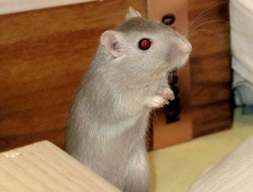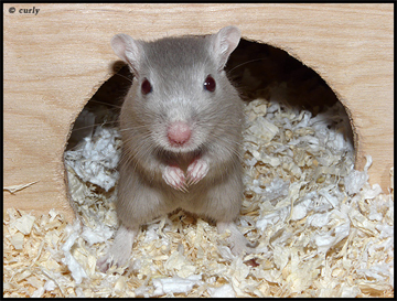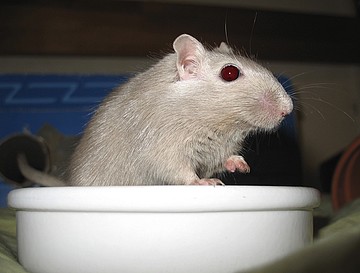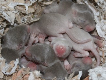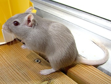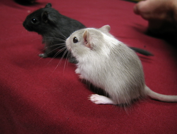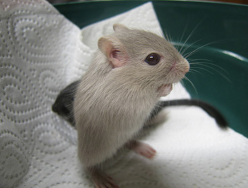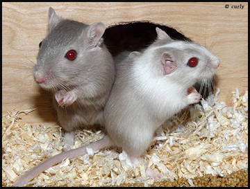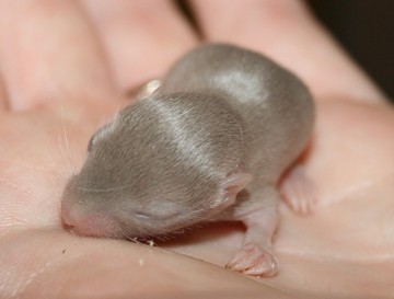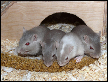 1 & 2 - bébés Lilac à 15 jours 3 - bébé Lilac à 4 semaines 4 - bébé Lilac Pied à 4 semaines 5 - bébé Lilac à 8 semaines 6 & 7 - bébés Lilac et Lilac Pied à 8 semaines A la naissance, la peau est très rose (sans aucune marque de coloration). La couleur de la paupière est rosée, comme le reste du corps (contrairement aux bébés aux yeux noirs qui ont une paupière très foncée). Cela indique de façon sûre que la gerbille aura les yeux rouges. A l'apparition du premier duvet, il prend une couleur irisée qui fonce de plus en plus jusqu'à s'uniformiser dans un gris clair satiné. Après la mue, la couleur varie au gris foncé tout en conservant ses reflets satinés. |