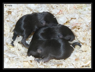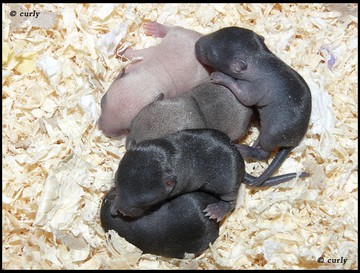 1 - bébé Slate à 3 jours 2 - bébés Slate à 7 jours 3 - bébés Slate à 10 jours 4 à 7 - jeune Slate à 8 semaines Les bébés Slate sont presque impossibles à différencier des bébés Black si l'on ne connait pas précisément le code génétique des parents. |
