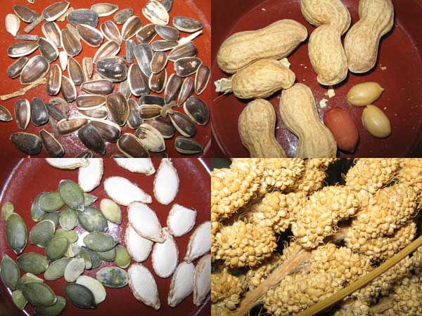 - des graines de courge : celles-ci peuvent être récupérées des courges (potiron, citrouille, courges) utilisées pour les potages d'hiver. Lavez bien et laissez sécher ces graines avant de les donner à vos gerbilles. Une photo ci-dessus vous montre des graines de courge au naturel à droite, et des graines de courge décortiquées et grillées. Les gerbilles les adorent.