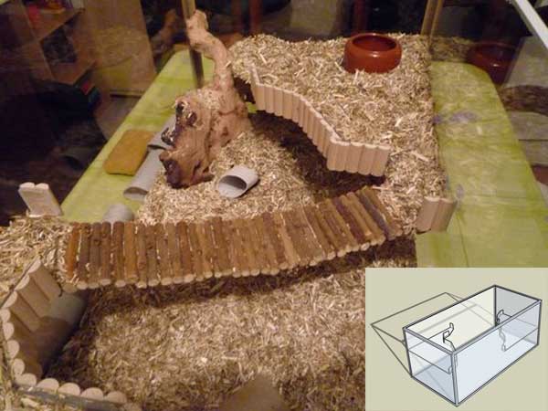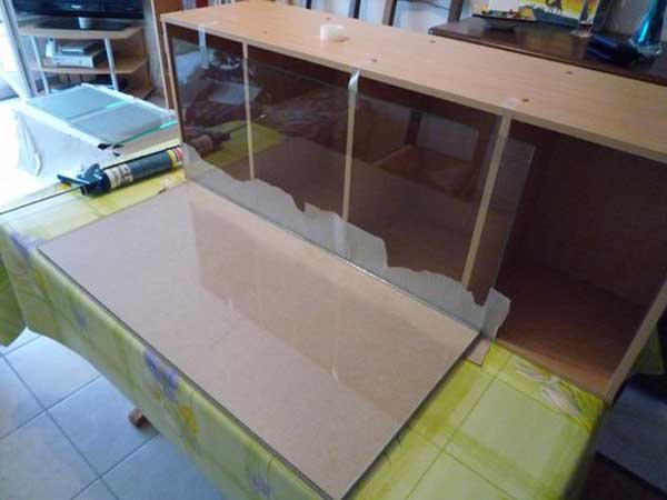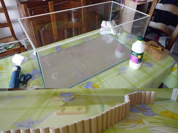 Découper des étages de forme variée dans la plaque de plexi. Utiliser la colle néoprène afin de fixer le décor en bois sur le bord des étages et afin de fixer les étages sur les parois de la cuve.
