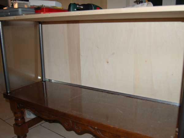 Visser les 4 pieds dans les angles du meuble de base, poser la planche en bois par dessus et visser les pieds à cette dernière également.