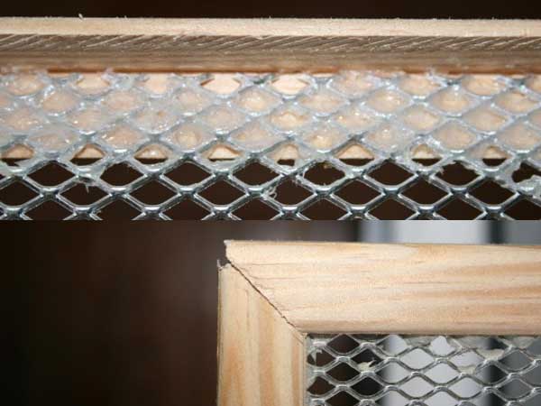 Etalez la silicone sur la partie des tasseaux à coller puis appliquez le grillage découpé aux bonnes dimensions par dessus en appuyant pour que la colle traverse les mailles et adhère mieux en séchant. Posez le couvercle sur une surface plane et respectez le temps de séchage.